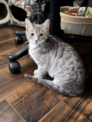 Blossom is the sweetest little six-month-old female light grey tabby. She is super loving and playful. She loves affection and playing the “Mouse for Cats” game on the iPad.