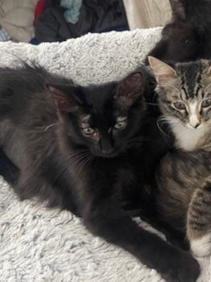 A black kitten sits on a fuzzy blanket. His tabby sibling is sitting beside him, slightly off camera.